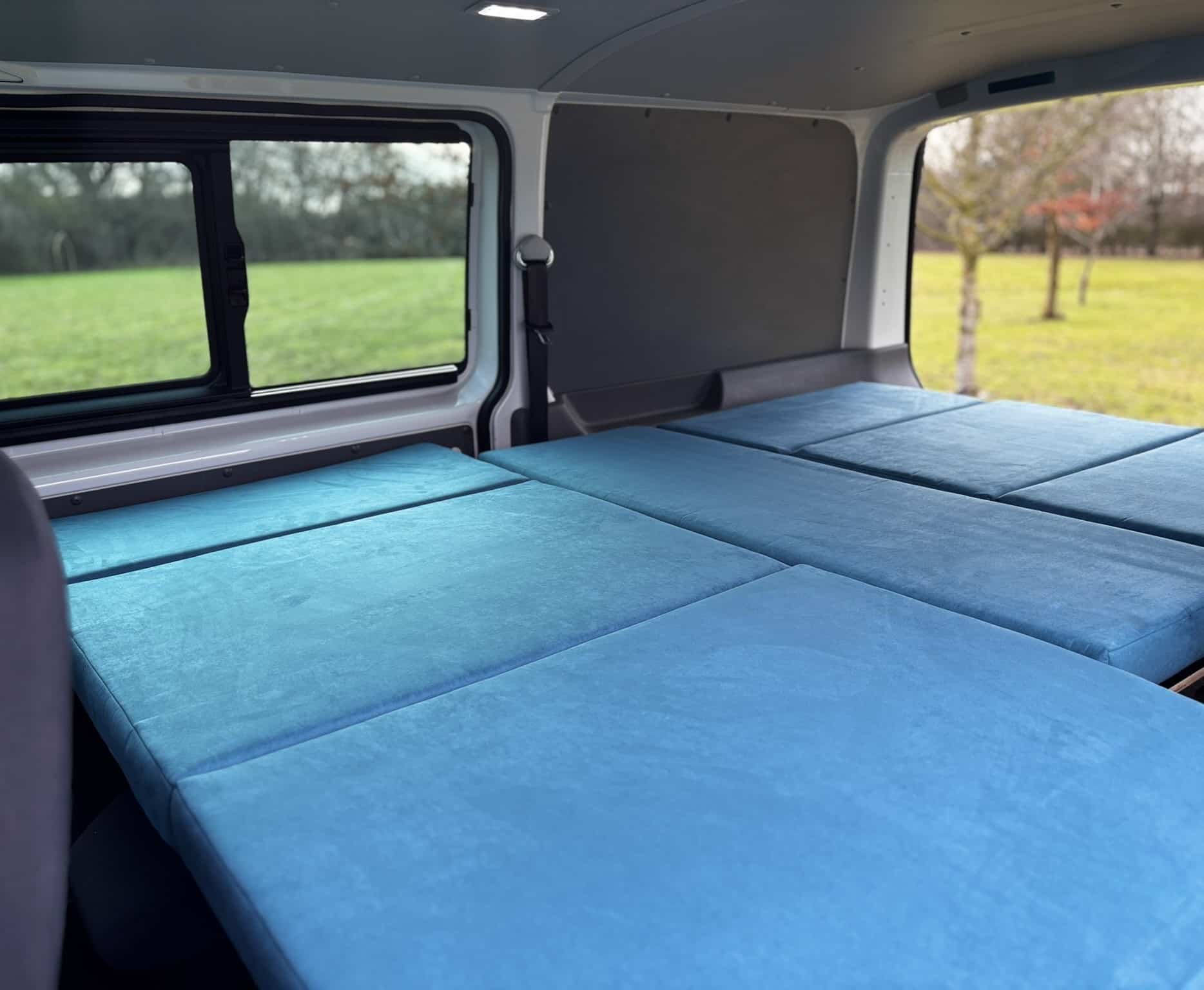 Tagsüber genießen Sie eine komfortable, in sich geschlossene Küche sowie einen U-förmigen Sitzbereich im Innenraum (mit großzügiger Stehhöhe). Nachts verwandeln Sie das Ganze in weniger als 30 Sekunden in ein Doppelbett — und das ganz ohne Ausbau der Rücksitze oder dauerhafte Veränderungen am Fahrzeug.